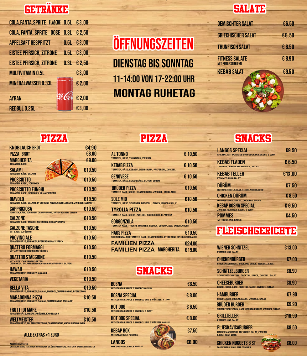 Dienstag bis Sonntag von 11 - 14.00 Uhr und 17 - 22.00 UhrGenießen Sie eine kulinarische Reise mit unserer vielfältigen Speisekarte, die von herzhaften Pizzen über leckere Snacks bis hin zu saftigen Fleischgerichten und erfrischenden Salaten reicht.
